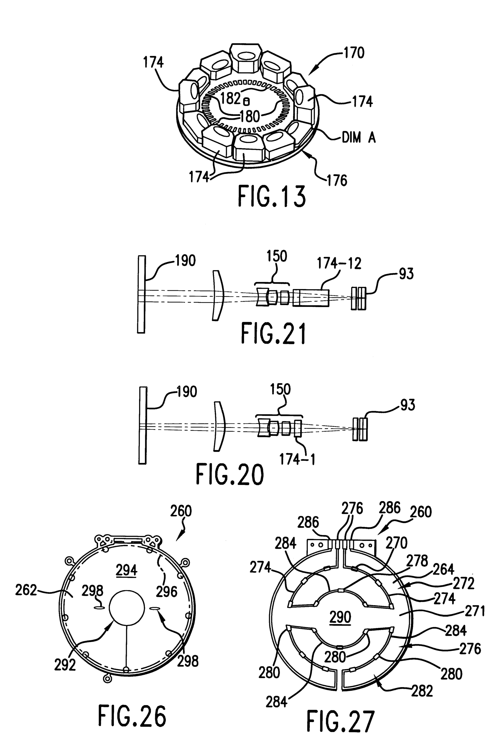 A plurality of timing or position indicating openings 180 (FIGS. 13-15) may be either formed through shim carrier 176 in a circle within and concentric with shims174 or imprinted on a surface of shim carrier 176. An initial position opening 182is also formed through shim carrier 176. Openings 180, 182 are disposed to be sensed by a conventional encoder transmitter 184(FIG. 5) to provide a signal to a counter mechanism of electronic package 94 that, in turn, provides an output indicative of the position of focusing disk 170. An encoder receiver 186 is connected in circuit with electronic package 94 to provide control signals to motor172 for focusing disk 170.