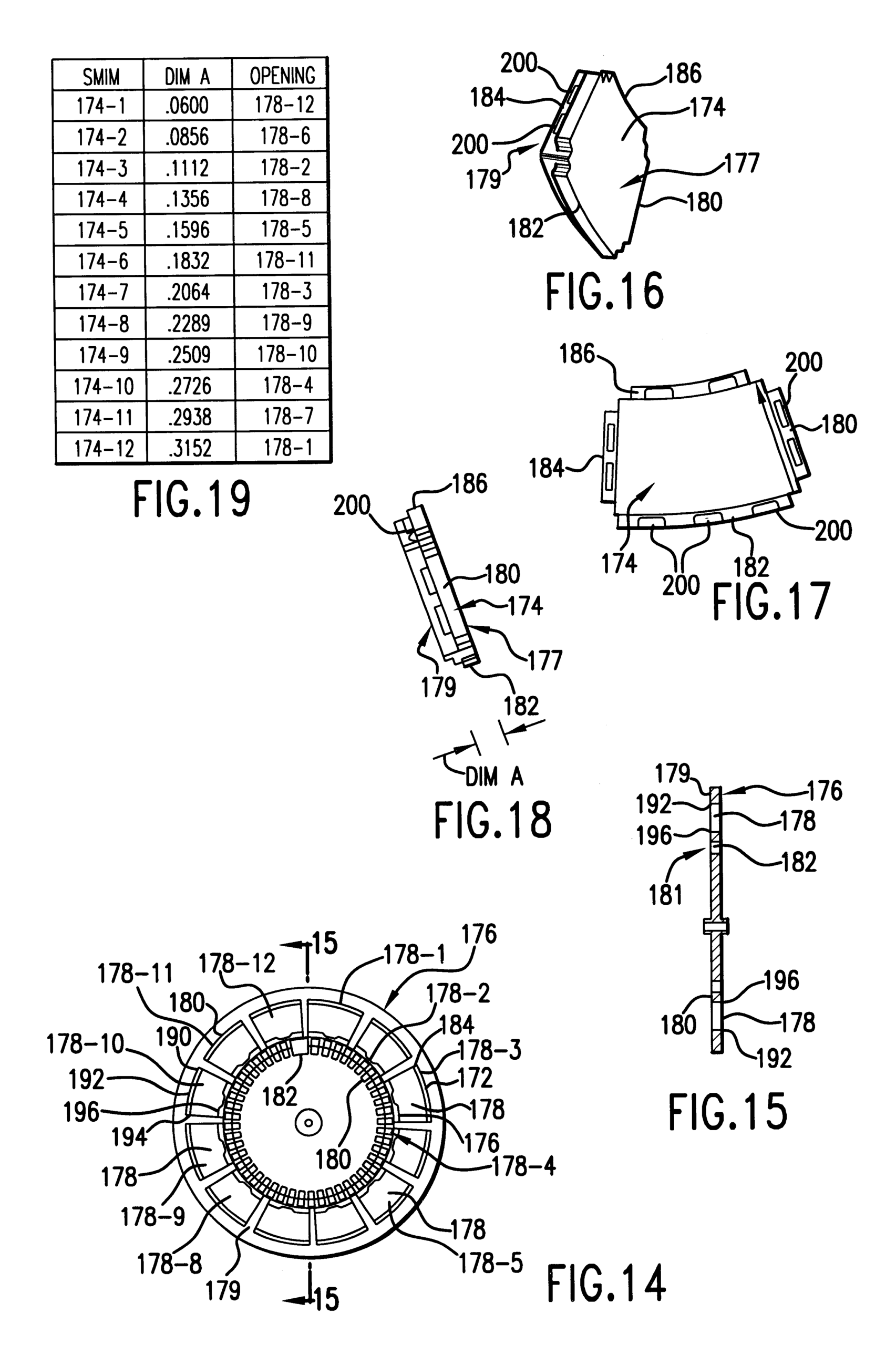 5,7 and 13) that functions to facilitate-photonics and focusing of imager 30 as more fully described in said J.Van Tassel et al. and J. Dowling applications. A motor 172 (FIGS. 5 and 7) rotates focusing disk 170 about an axis of rotation that is offset from an optical axis OA for object taking lens arrangement 150 and so as to successively position optical plates or shims 174 (FIGS. 5, 7,13 and 15–17)in alignment with said optical axis OA. A shim carrier 176 (FIGS. 5, 7, and 13–15), of disk 170, is formed with shim openings 178 (FIGS. 14 & 15) distributed in a circle proximate the periphery of carrier 176. There are twelve shim openings 178provided in carrier 176 to respectively receive twelve shims 174 arranged and for purposes described in said aforementioned applications. Each such shim 174 is fabricated from optical material and is in the configuration of a sector of a ring, as seen in FIGS. 16 and 17. A lip (FIGS. 16-18) 180,182, 184, and 186 extends respectively from each side of shim 174. Each lip 180–186 is sized and positioned to rest upon a corresponding lip (FIGS. 14 and 15) 190,192, 194 and 196respectively formed within each shim opening 178 of carrier 176. Resilient prongs200 (FIGS. 16-18) extend out from lips 180–186 of shims 174 to facilitate seating of shims 174 in openings 178. Shims 174 may be otherwise secured within openings 178 by adhesive or other means. It should be noted in FIG. 13 that shims 174 are of different thicknesses “DIM A” (FIG. 18). The respective thicknesses “DIM A” are selected to provide different focusing for camera engine92 upon imaging receiver 93 as more specifically described in said J. Van Tassel and J. Dowling applications. For example one set of thicknesses (DIM A) for shims 174 is listed in the table of FIG. 19. The respective shims 174 would be secured in openings 178, for example, in the following order reading clockwise (direction of arrow C—FIG. 14) from the one o’clock position. Shim 174–12 in opening 178–1, shim 174–3 in opening 178–2, shim 174–7 in opening 178–3 and so forth according to the table of FIG. 19. Shims 174 are so arranged to balance rotating focusing disk 170. A face surface 177 of shims 174, when so seated in openings 178, will be flush with a face surface 179 of shim carrier 176 with a back surface 179 of each shim 174 extending out from a back surface 181 of carrier176.